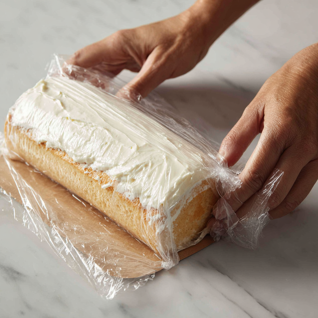 Unroll the cooled cake gently. Spread the cream cheese filling evenly across the surface, leaving about ½ inch at the edges. Carefully re-roll the cake (without the towel) and wrap it tightly in plastic wrap.