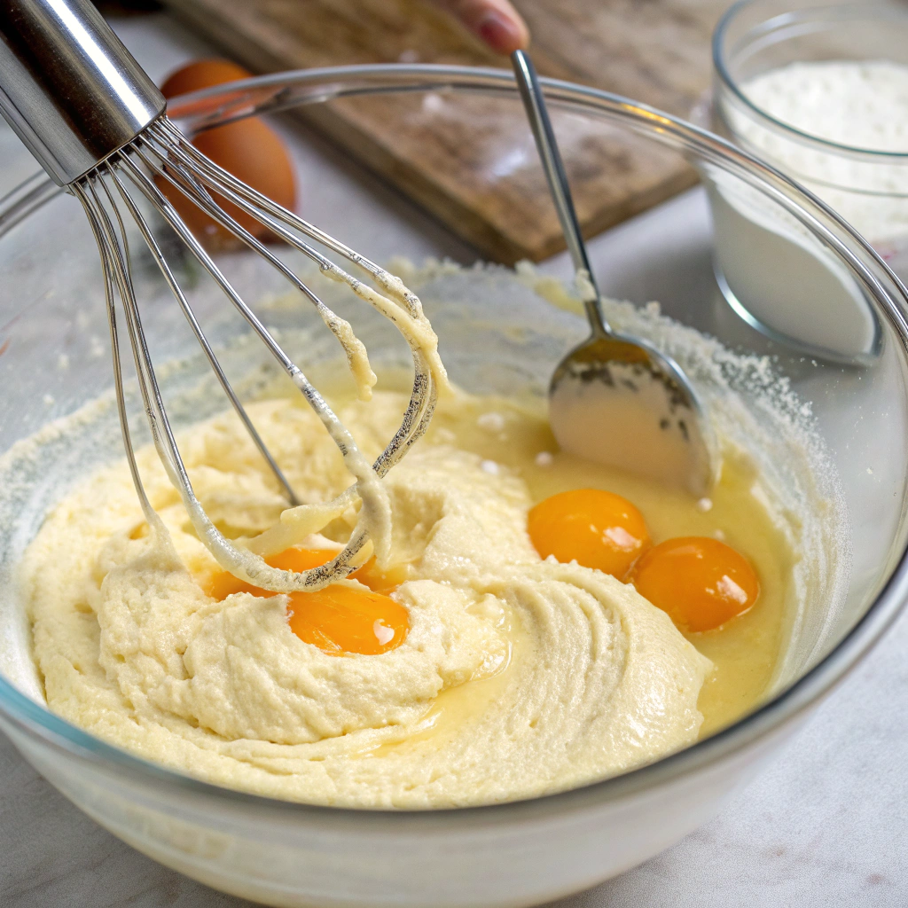 Beat in eggs, one at a time, then add vanilla extract. Make sure each egg is fully incorporated. The mixture should be creamy and slightly fluffy.
