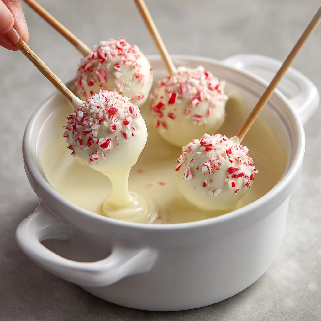 Dip each cake pop into the melted white chocolate, gently tapping off excess. Immediately sprinkle with crushed candy canes and any extra decorations.