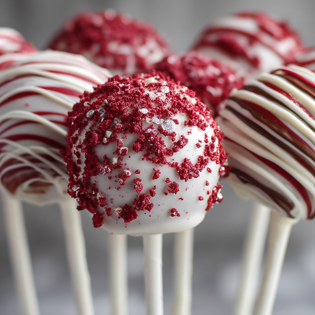 Mix red velvet crumbs with frosting, swirl in chocolate crumbs, roll, chill, dip, decorate, and let set