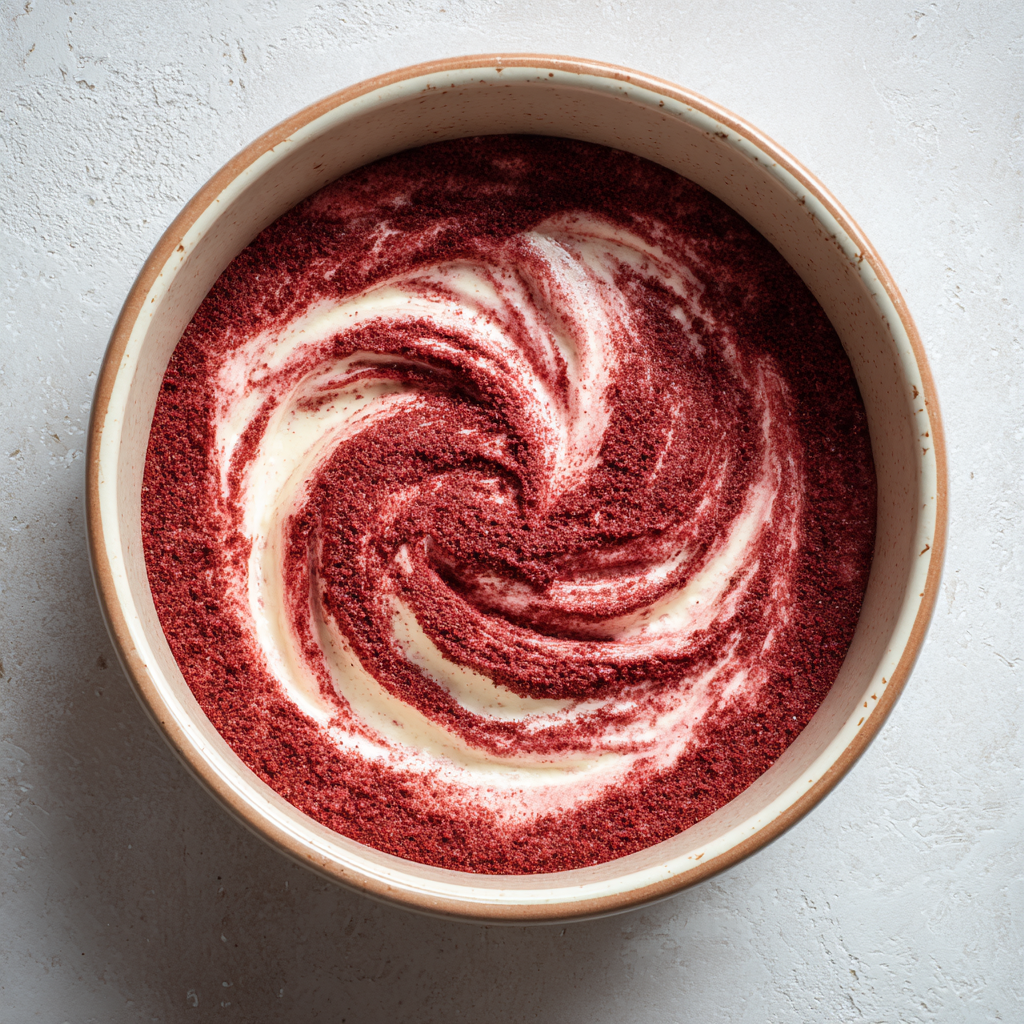 Now comes the magic. Gently fold in the chocolate cake mixture. Do not overmix — you want to see distinct red and chocolate swirls.
