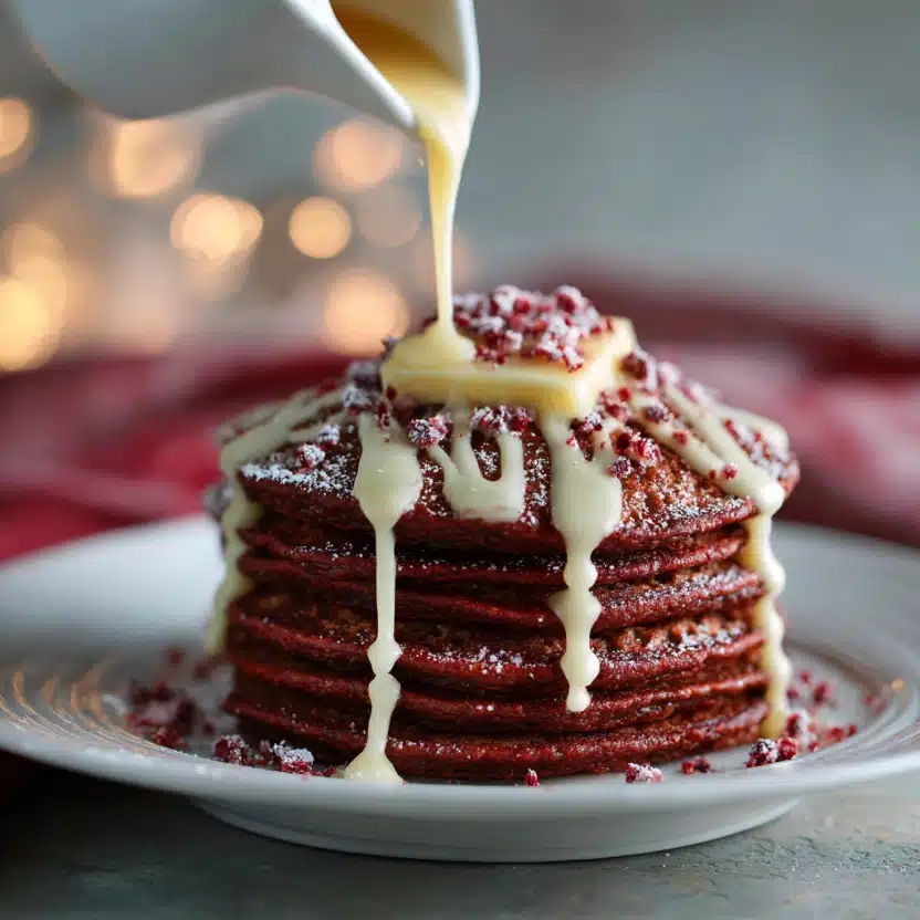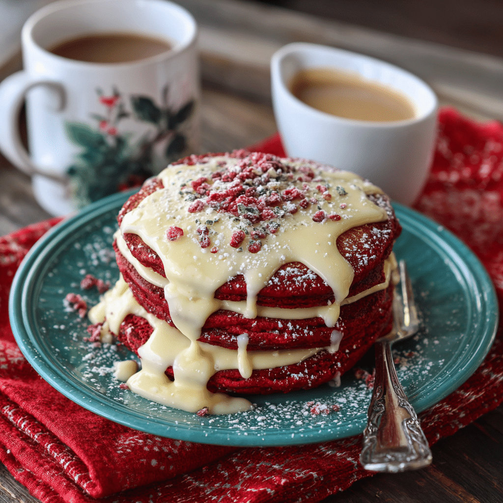 Indulge in cozy mornings with these Red Velvet Pancakes with Cream Cheese Glaze. Soft, fluffy pancakes meet a smooth, sweet glaze for a perfect breakfast treat that will delight your family and friends.