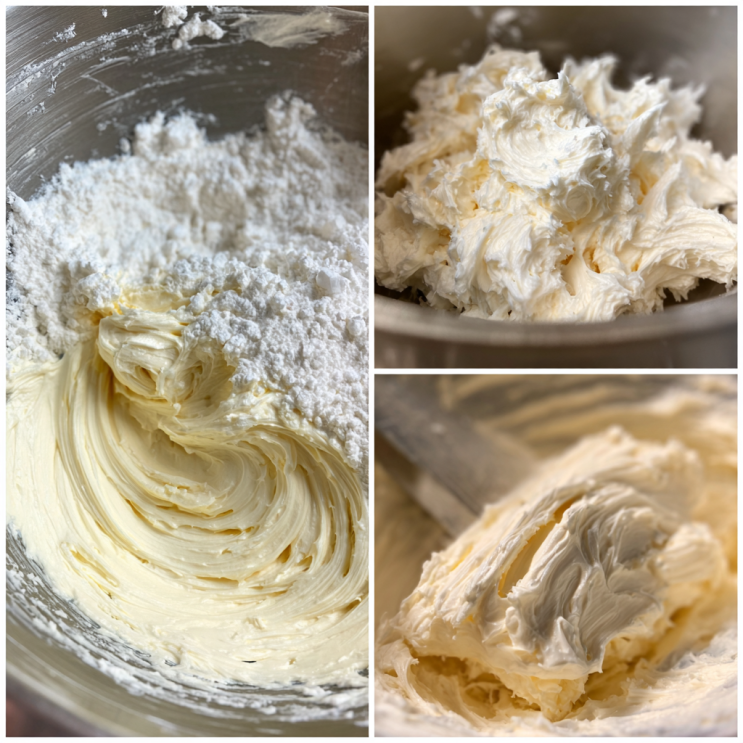 Beat the cream cheese and butter together until smooth. Slowly add powdered sugar and vanilla. Continue mixing until the frosting becomes fluffy and creamy.