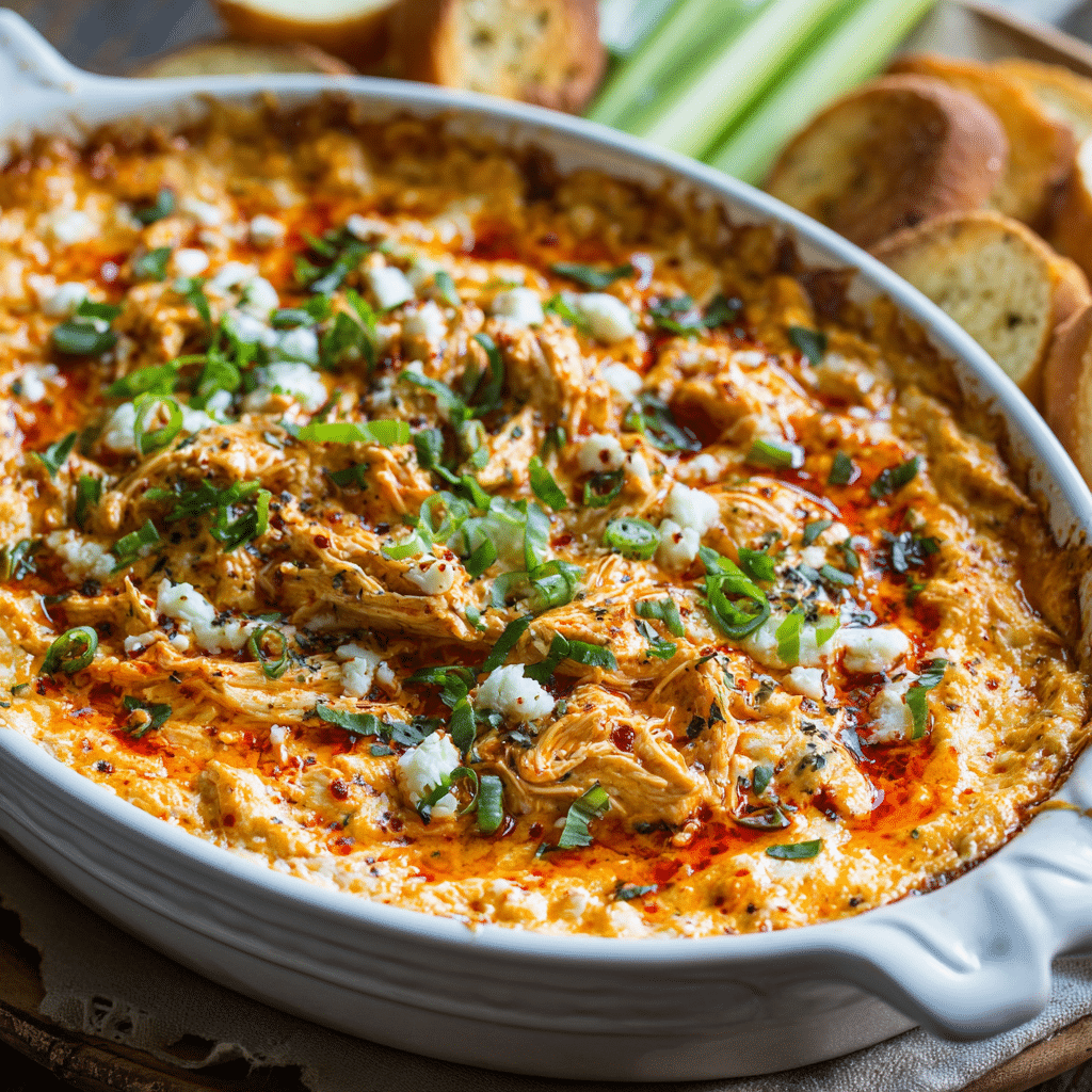 My Rich and Spicy Buffalo Chicken Dip is creamy, bold, and full of comforting heat. I make it with shredded chicken, cream cheese, sour cream, sharp cheddar, mozzarella, and buffalo sauce for a dip that’s indulgent and irresistible. Baked until bubbly and finished with green onions, it’s perfect for game nights, gatherings, or cozy evenings at home. Serve it with chips, veggies, or bread, and watch it disappear fast. This is one of those recipes that brings people together, sparks conversation, and turns simple moments into warm memories.
