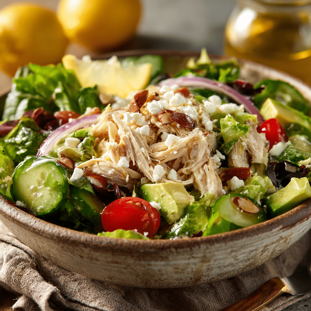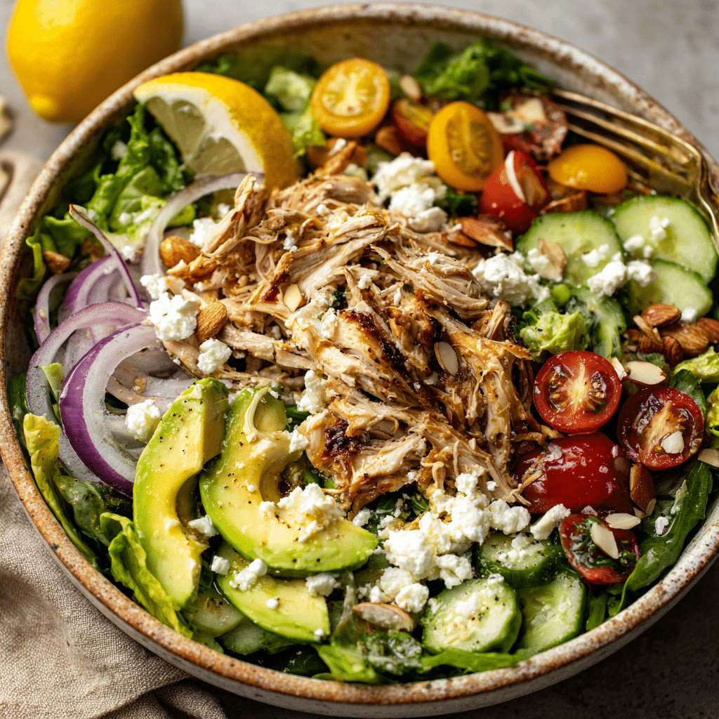 I love making this salad because it’s versatile and forgiving. You can use a store-bought rotisserie chicken, leftover roasted chicken, or even grilled chicken breasts. The lemon dressing is bright and fresh, which balances the savory chicken and crunchy greens beautifully. Every time I serve it, my family is delighted by the mix of textures crisp lettuce, juicy tomatoes, creamy avocado, and tender chicken all coated lightly in a zesty, homemade dressing.