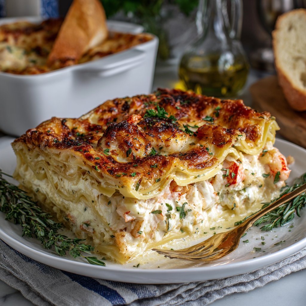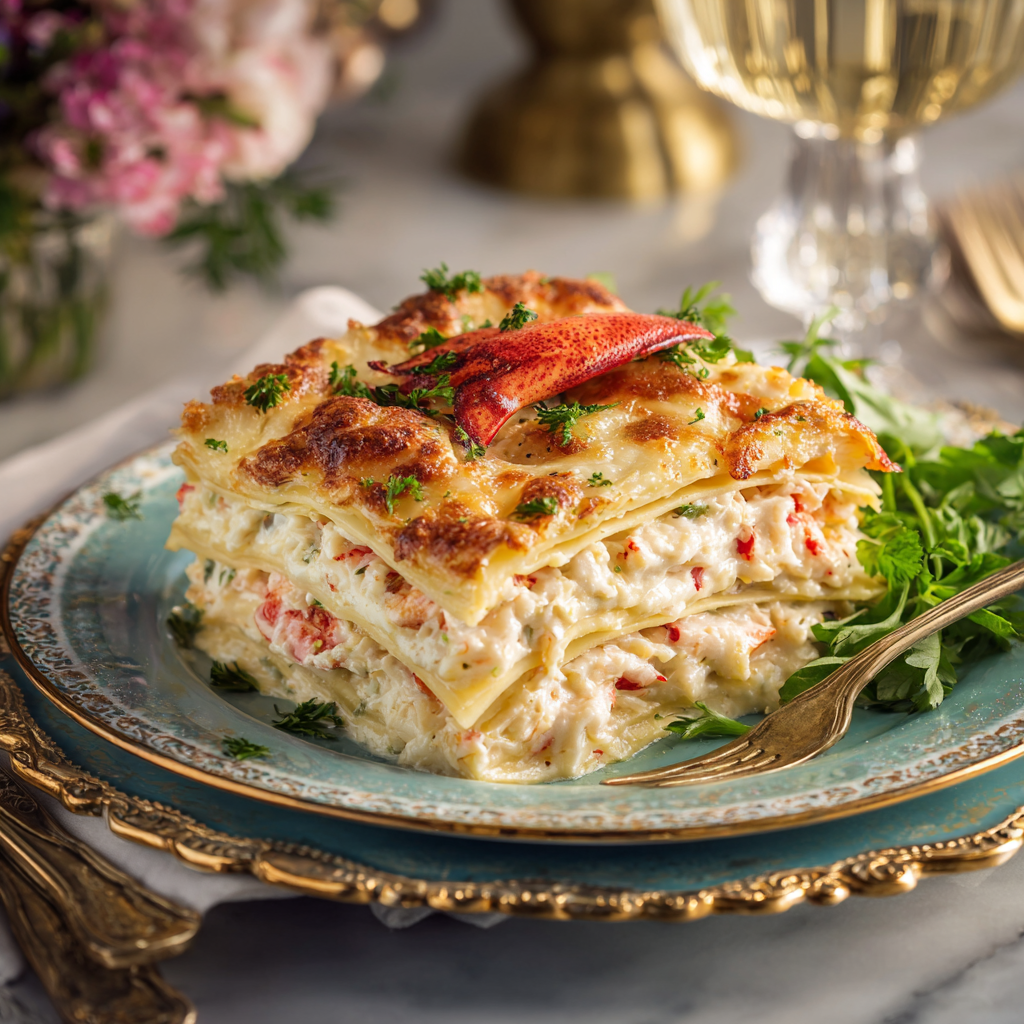 🧺 Ingredients: Lobster, shrimp, olive oil, garlic, onion, white wine, lasagna sheets, butter, flour, milk, nutmeg, mozzarella, Parmesan, parsley