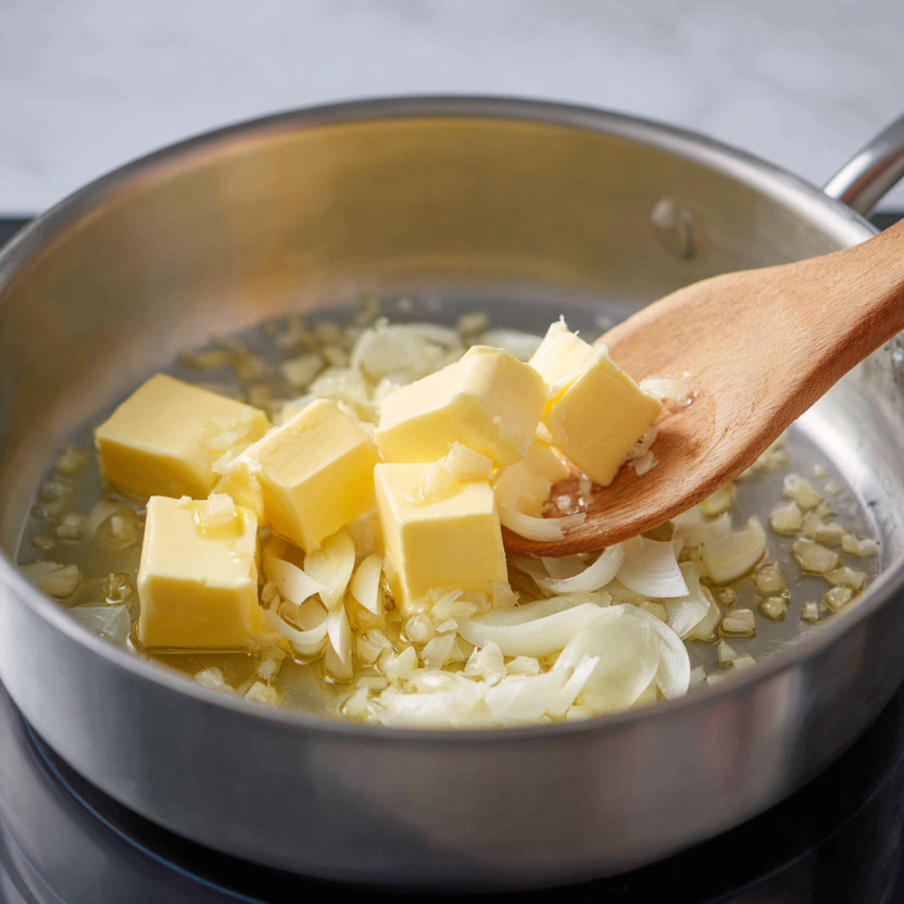 In a medium saucepan, melt the butter over medium heat. Add chopped onion and garlic. Cook until softened and fragrant, about 3-4 minutes.