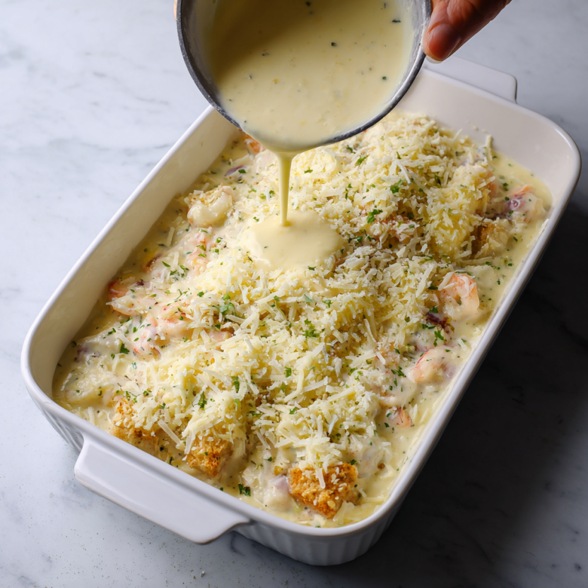 Place the seafood evenly in the prepared baking dish. Pour the Mornay sauce over the seafood, making sure everything is coated. Sprinkle the remaining Gruyère and Parmesan cheese on top.