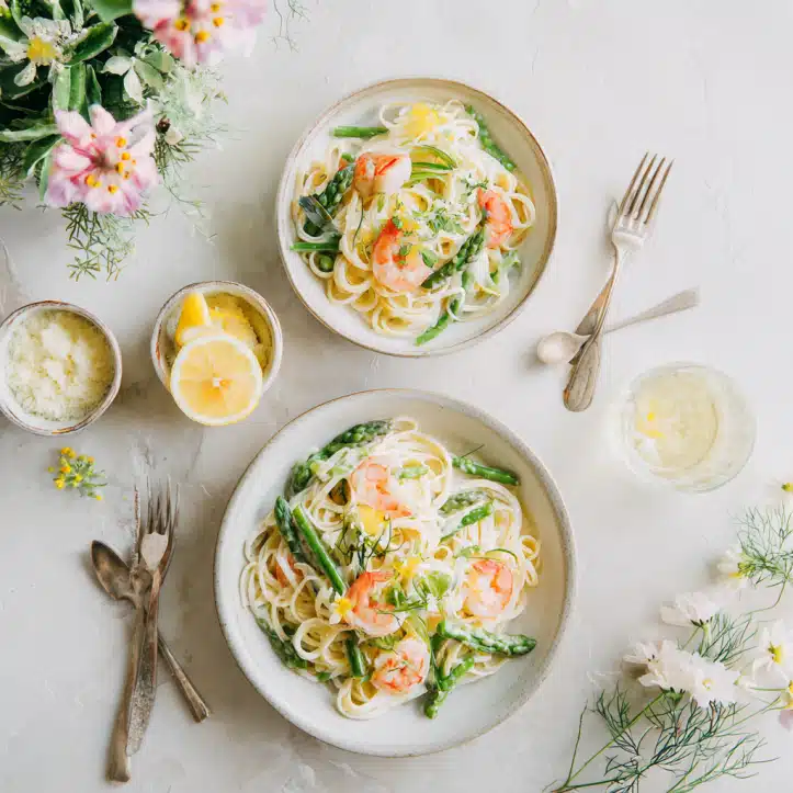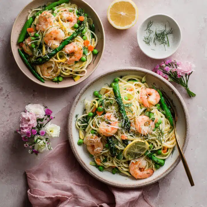 Use any seasonal vegetables you have on hand. Don’t overcook shrimp. Add herbs at the end for maximum freshness. Leftovers keep well in the fridge for 2 days; reheat gently with a splash of pasta water.