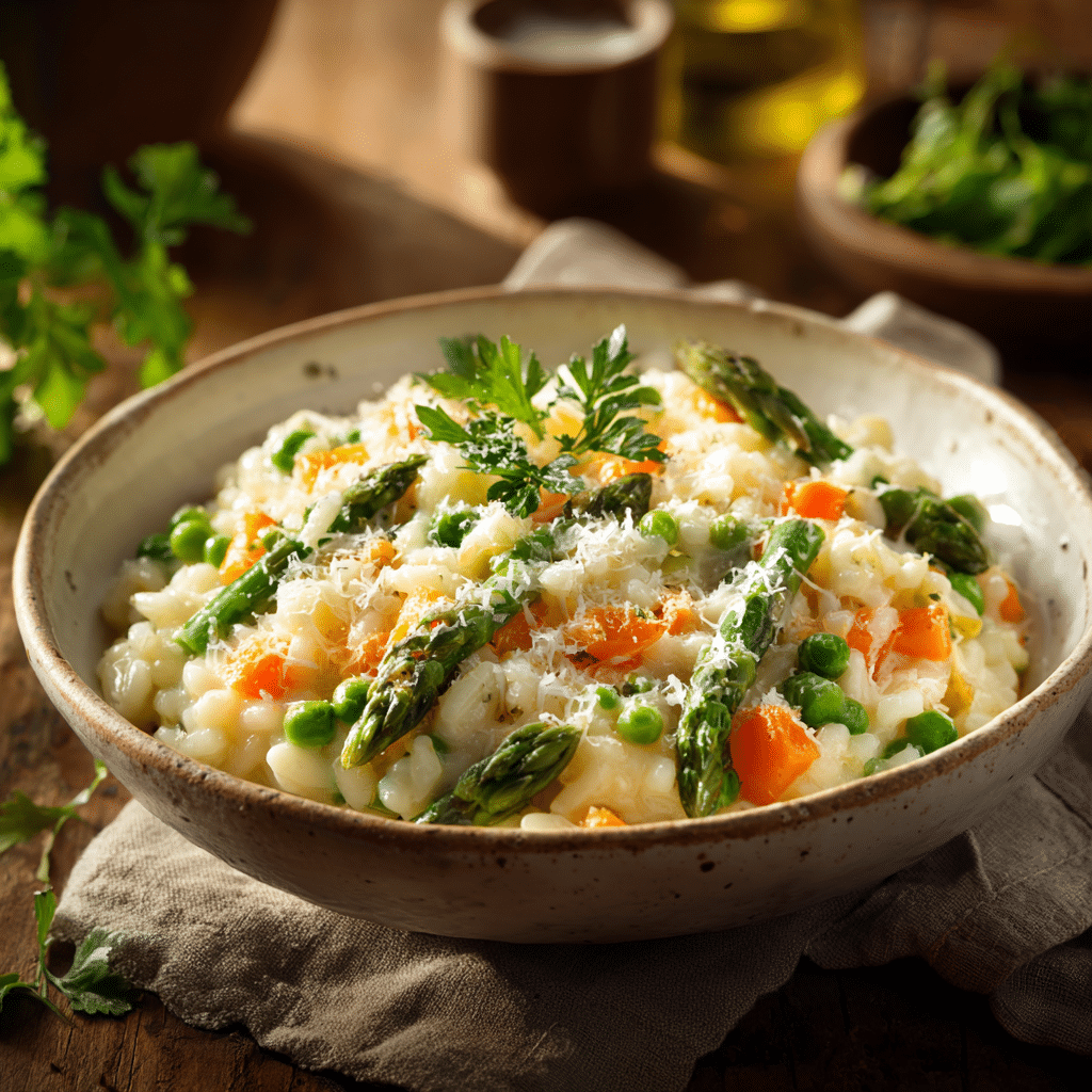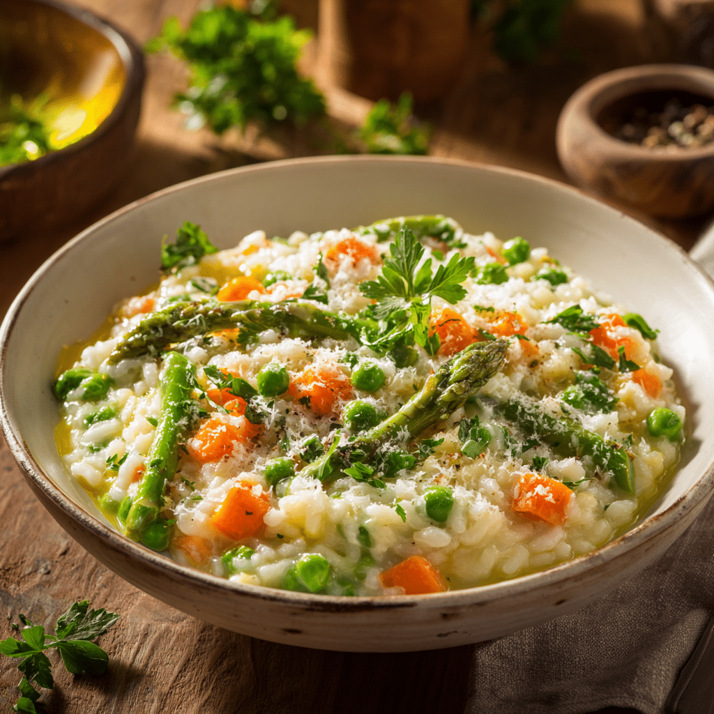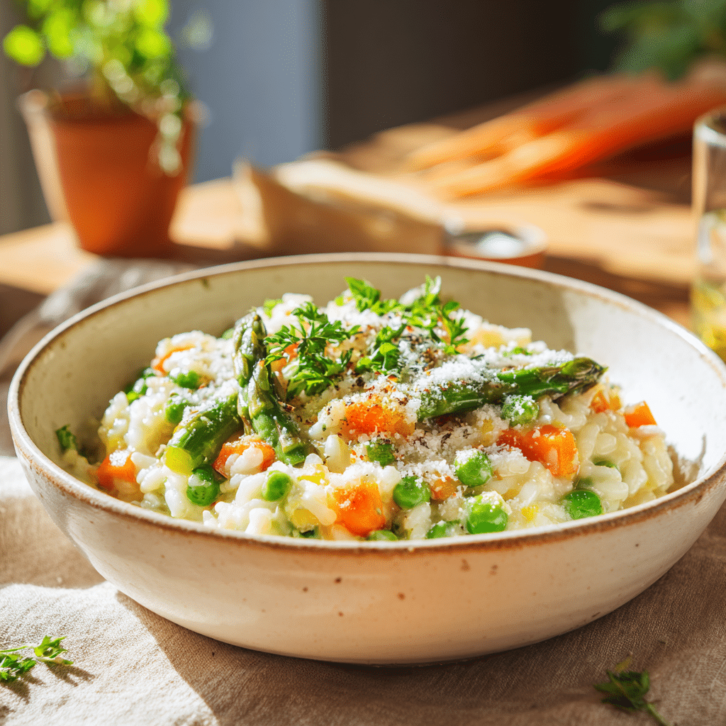 One of my most cherished memories is a sunny spring afternoon in my kitchen, chopping fresh vegetables while soft music plays in the background. That day, I decided to make a Simple Spring Vegetable Risotto, inspired by the fresh flavors of the season tender peas, crisp asparagus, and sweet carrots. The creamy rice, slowly stirred and enriched with Parmesan and butter, filled the house with such a comforting aroma that my family couldn’t resist peeking into the kitchen. That dish reminded me of why I fell in love with cooking: it’s not just about food, it’s about creating warmth, sharing joy, and bringing people together.