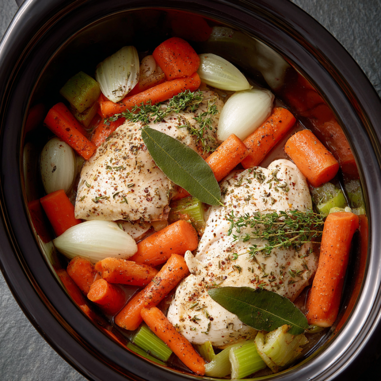 Place the chicken breasts at the bottom of the slow cooker. Add carrots, celery, onion, garlic, dried herbs, bay leaves, salt, pepper, and broth. Cover and cook on: