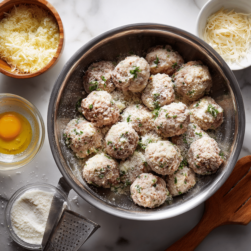 - Mix meatball ingredients and form 1 ½-inch balls.