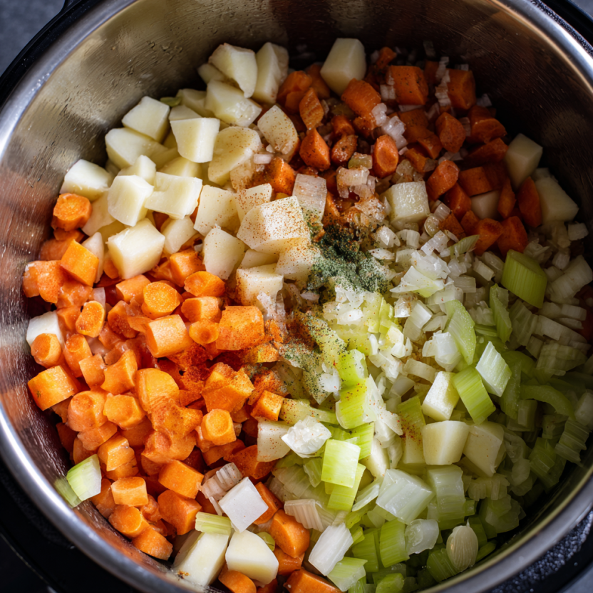 Add diced potatoes, onions, carrots, celery, and garlic to the pot. - Season the veggies.