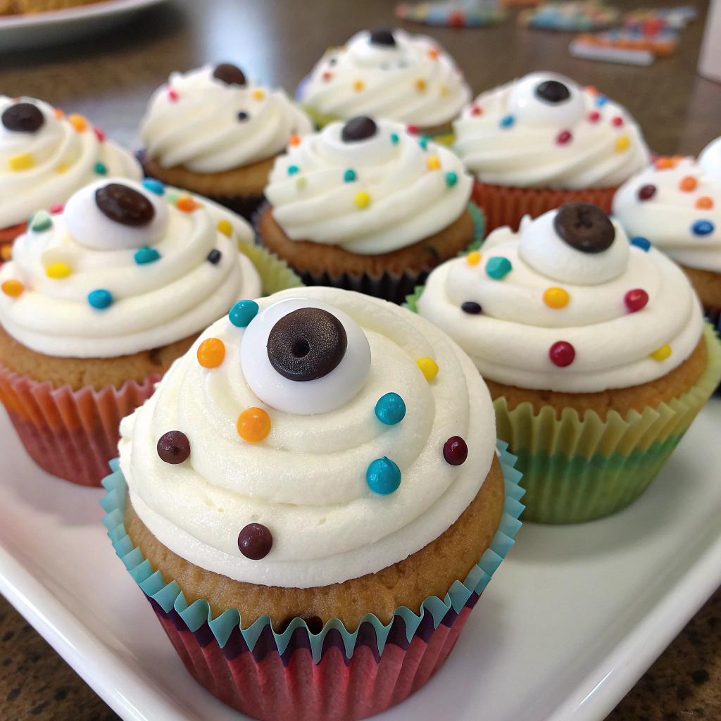 Place candy eyes on the front of each frosted cupcake. If you don’t have candy eyes, use white icing dots with a small chocolate chip on top.