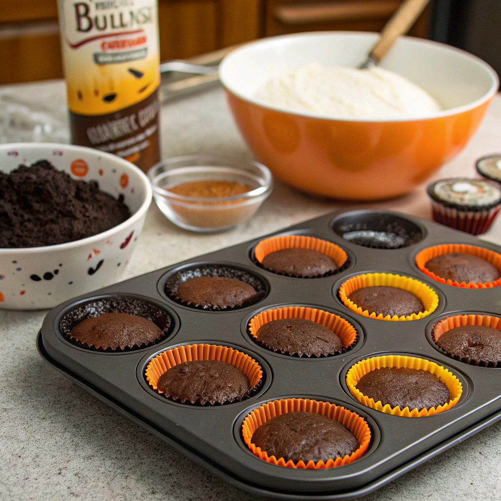Preheat oven to 350°F (175°C) and line a cupcake pan with Halloween-themed liners. In one bowl, whisk flour, cocoa, baking powder, baking soda, and salt. In another, beat butter and sugar until fluffy. Add eggs and vanilla. Mix dry ingredients into wet, alternating with milk, until smooth. Divide into liners and bake 18–20 minutes. Cool completely.