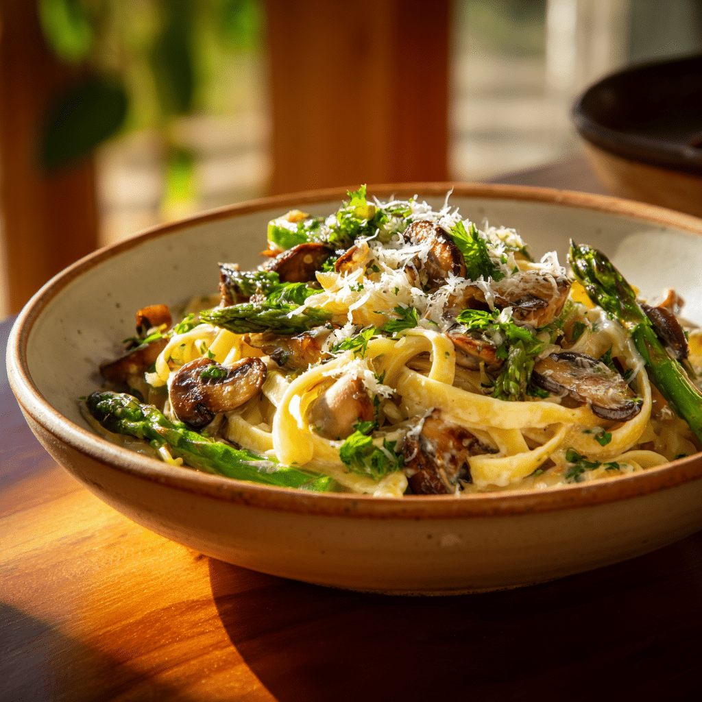 I love this recipe because it’s fresh, simple, and incredibly versatile. The flavors of spring vegetables like asparagus pair perfectly with the earthy mushrooms, and the creamy garlic sauce brings everything together in a silky hug. It’s fast enough for a weekday dinner but elegant enough for a weekend treat. Making it reminds me of my mother teaching me to sauté vegetables slowly and with care she always said that attention to small details makes a huge difference in flavor. I love how this recipe connects me to those memories while letting me create new ones for my family.