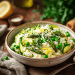 I make this Spring Vegetable Risotto with Parmesan when I want something creamy, fresh, and comforting. I sauté onion and garlic, toast Arborio rice, and slowly add warm broth while stirring. I mix in asparagus, peas, and zucchini, then finish with Parmesan, lemon zest, and butter. The result is rich, creamy, and full of spring flavors. I serve it warm with extra cheese and fresh herbs. It’s simple, satisfying, and perfect for sharing with family.
