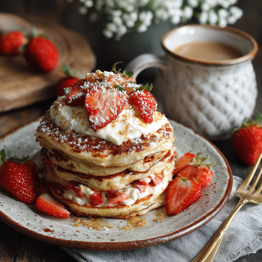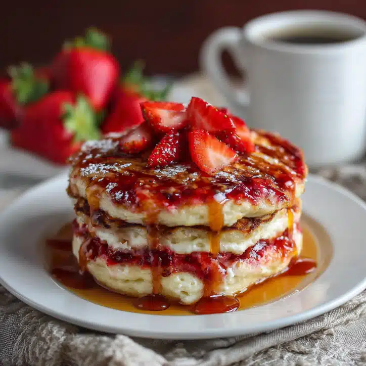 Indulge in these Strawberry Cheesecake Pancakes – fluffy pancakes layered with creamy cheesecake filling and sweet, juicy strawberries. Perfect for a cozy family breakfast or a special brunch, this recipe is easy to make and full of love.
