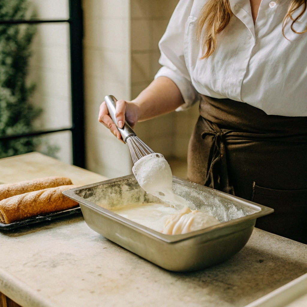 I carefully fold the strawberries into the cream, keeping the mixture light and airy. Then I slice the croissants horizontally without cutting all the way through. I pipe or spoon the strawberry cream generously inside each croissant.