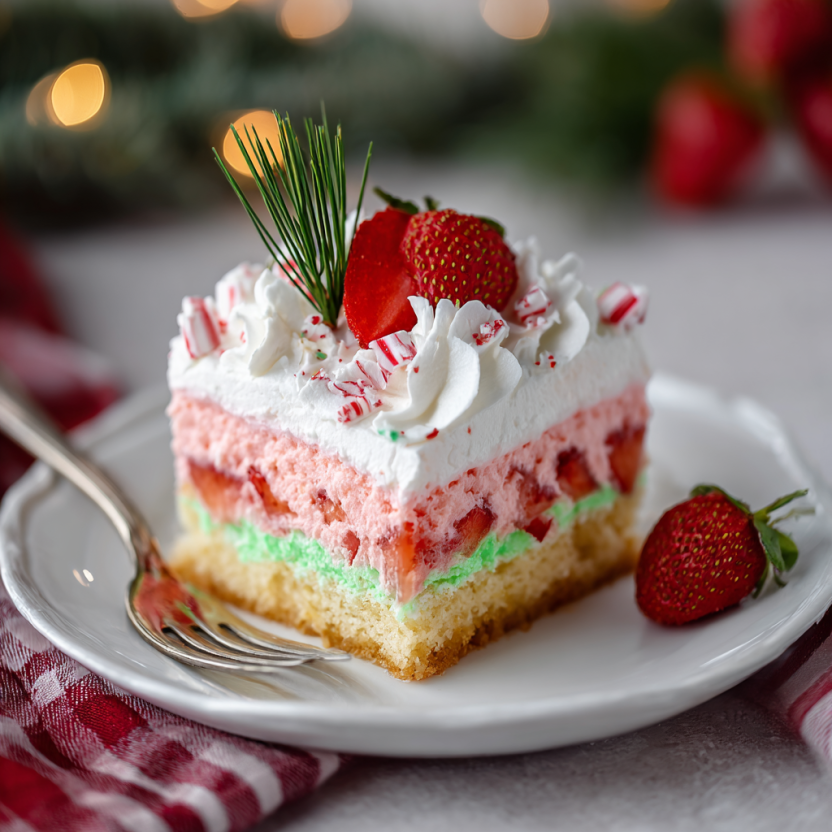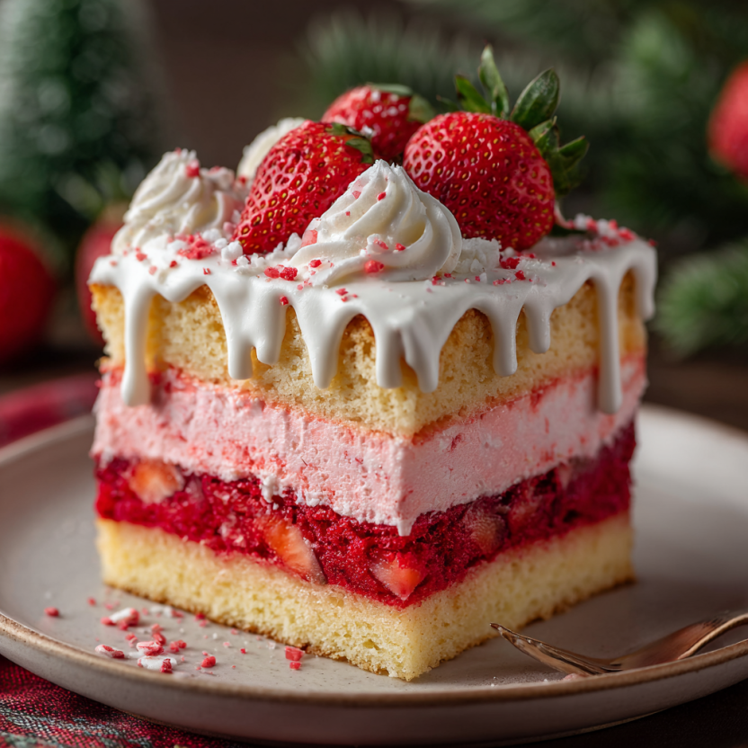 This festive Strawberry Poke Cake brings Christmas color and flavor together in one easy dessert. A soft white cake gets poked and soaked with bright strawberry syrup, creating a moist, flavorful bite every time. Topped with fluffy whipped cream, it’s simple, cheerful, and perfect for holiday gatherings. This cake is beginner-friendly, make-ahead ready, and always a crowd-pleaser. Serve it chilled and watch it disappear slice by slice it’s pure holiday joy with very little effort.