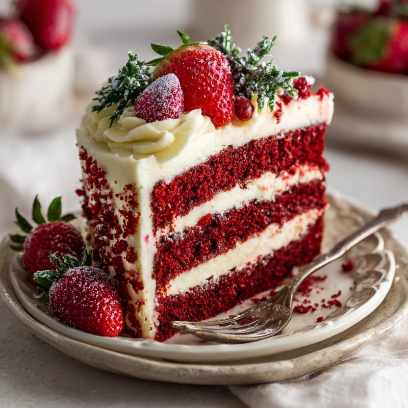 What I love most about this Strawberry Red Velvet Christmas Cake is how it blends classic holiday flavors with a fresh fruity twist. The rich cocoa notes of red velvet meet the bright sweetness of strawberries, and the cream cheese frosting ties it all together with a smooth, tangy finish. It feels festive, elegant, and comforting all at once.