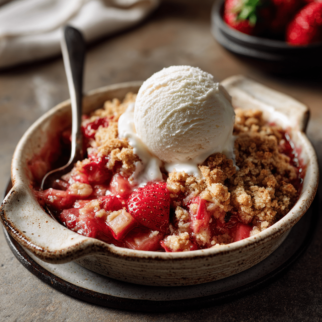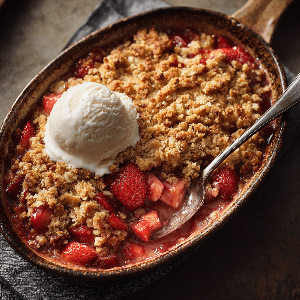 A cozy Strawberry Rhubarb Crisp with Crumble Topping made with sweet strawberries, tangy rhubarb, and a buttery golden crumble. This comforting dessert is easy to bake and perfect served warm with vanilla ice cream.