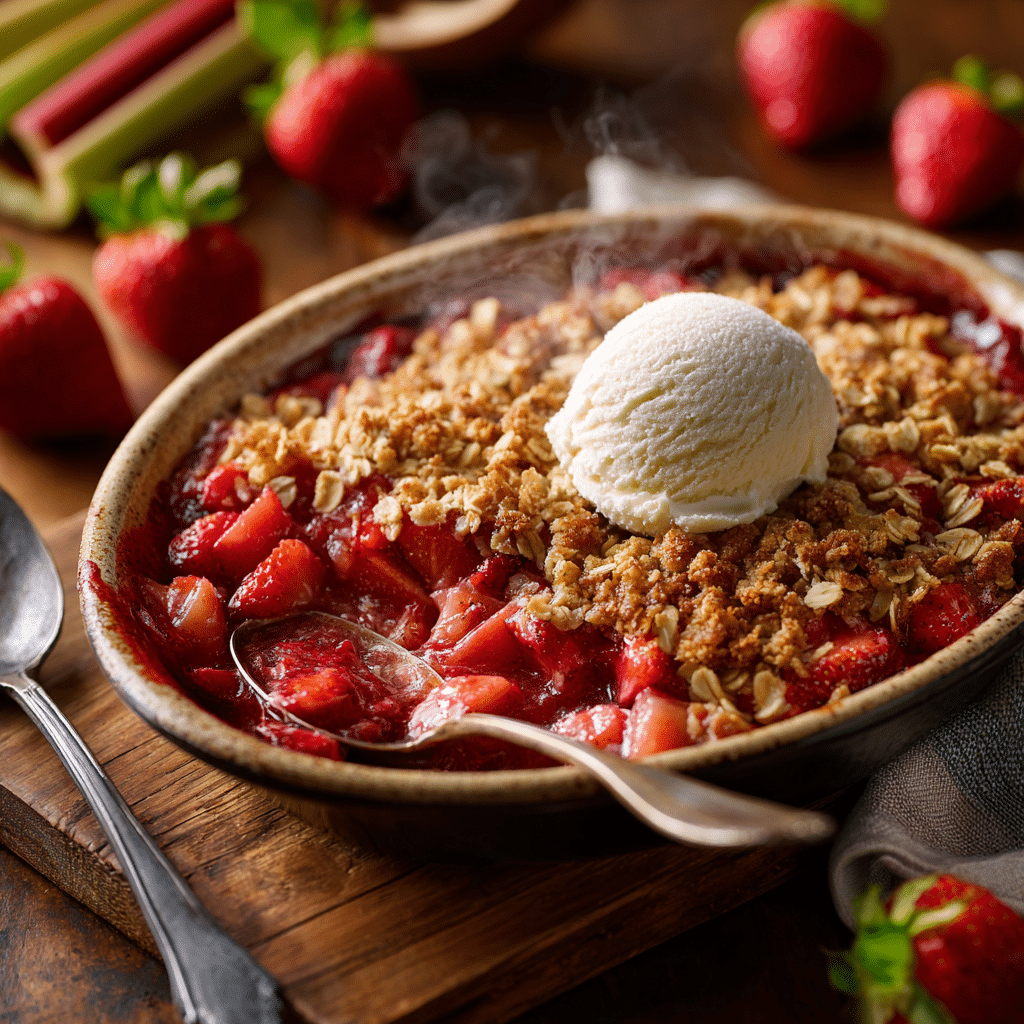 A cozy Strawberry Rhubarb Crisp with Oat Topping made with sweet strawberries, tangy rhubarb, and a buttery oat crumble baked until golden and bubbling. Perfect served warm with vanilla ice cream.