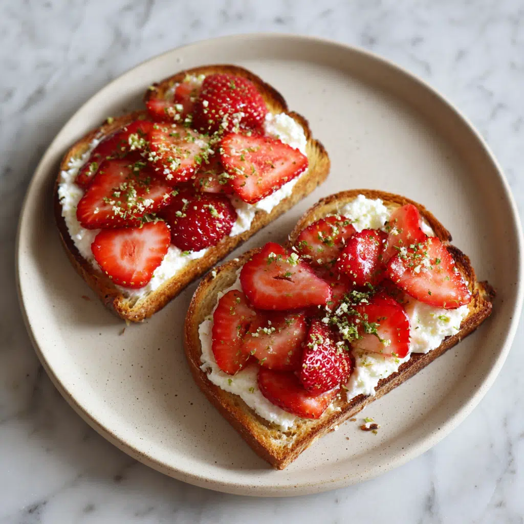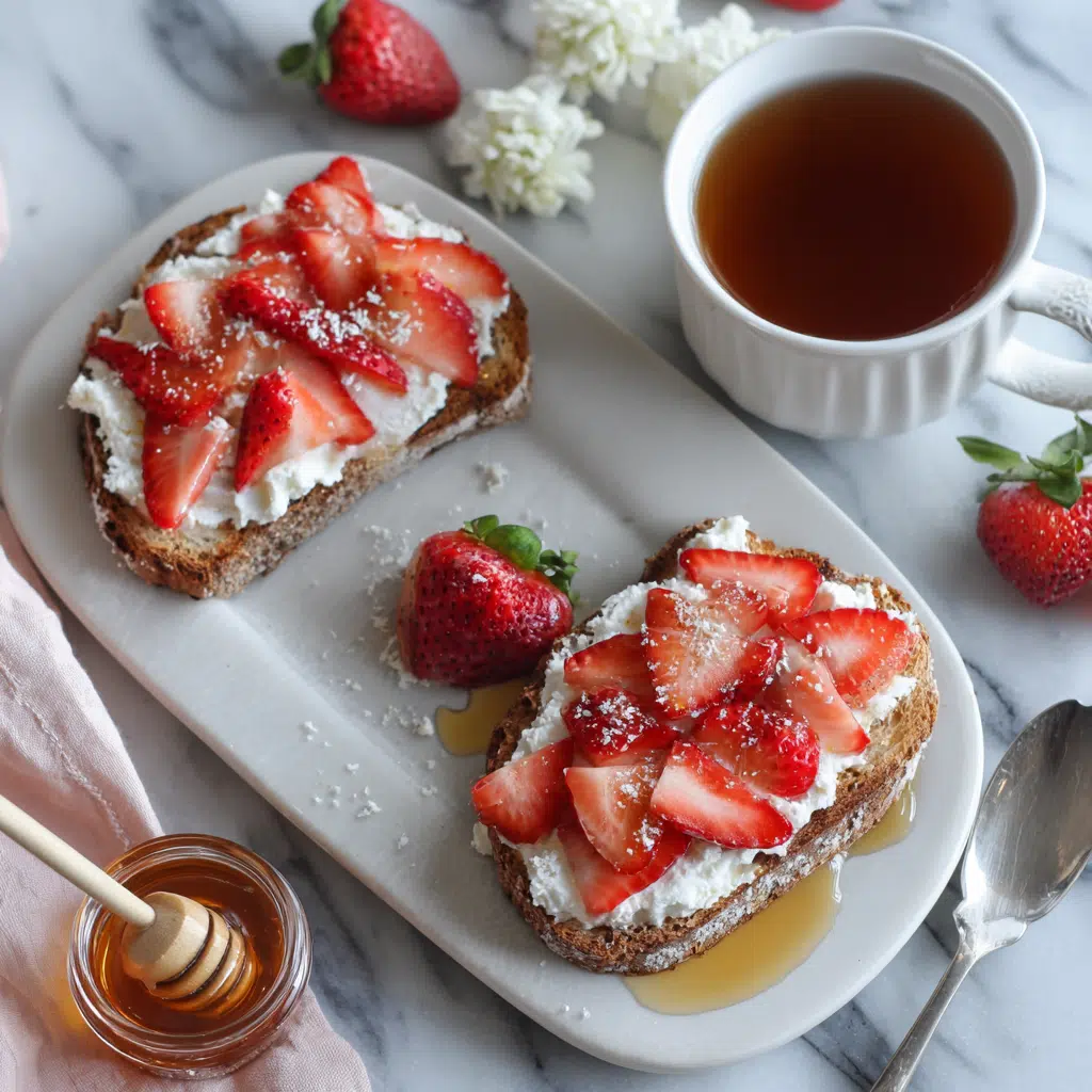 👩🍳 Instructions <ol> <li>Toast sourdough slices until golden.</li> <li>Mix ricotta with vanilla extract until creamy.</li> <li>Hull and slice strawberries evenly.</li> <li>Spread ricotta on warm toast slices.</li> <li>Arrange strawberries on top of ricotta.</li> <li>Drizzle honey, sprinkle sea salt, add mint or almonds if desired.</li> <li>Serve immediately while warm.</li> </ol>