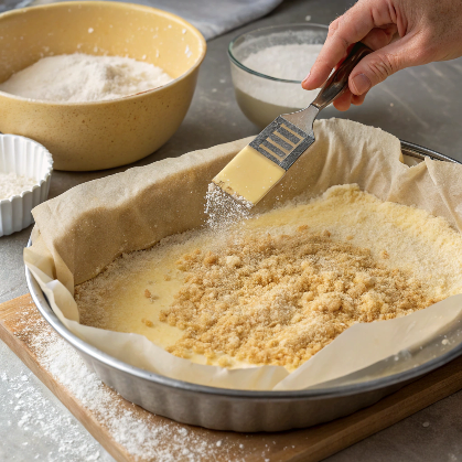 Preheat your oven to 350°F (175°C). Grease a 9×13-inch baking pan and line with parchment paper. In a large bowl, combine flour, sugar, baking powder, and salt. Cut in the cold butter using a pastry cutter or fingers until the mixture resembles coarse crumbs. Press half of the mixture evenly into the prepared pan to form the crust. Bake for 12–15 minutes until lightly golden.