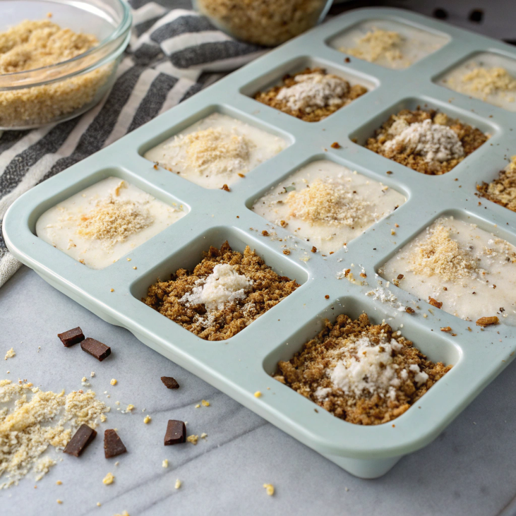 Spoon about one tablespoon of the mixture into each silicone mini muffin mold or ice cube tray and press down firmly to form a base. Freeze for 10 minutes to set.