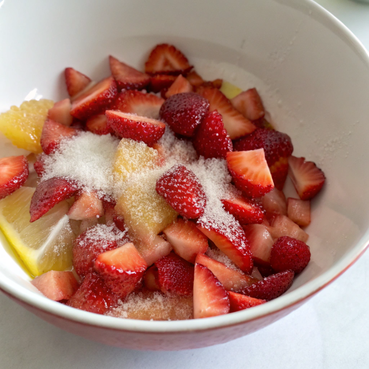 Combine diced strawberries with sugar and lemon juice in a bowl. Let sit for 10–15 minutes to macerate. The fruit will become soft, glossy, and syrupy perfect for layering.