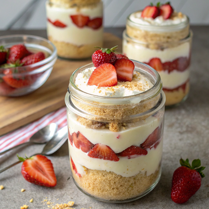 There’s something joyful about desserts in jars they’re personal, pretty, and packed with flavor. These Strawberry Shortcake Pudding Jars bring together creamy pudding, buttery shortcake crumbs, and juicy strawberries in perfect harmony.