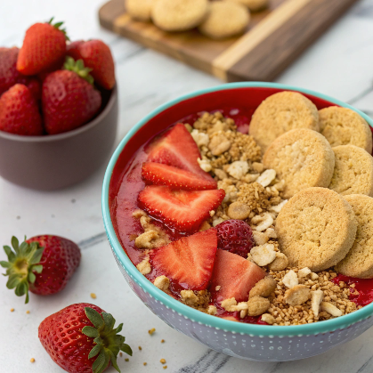 Top with sliced strawberries, crushed shortbread biscuits, and your favorite granola or coconut flakes. The biscuit crumbs add that signature shortcake flavor that makes this smoothie bowl irresistible.
