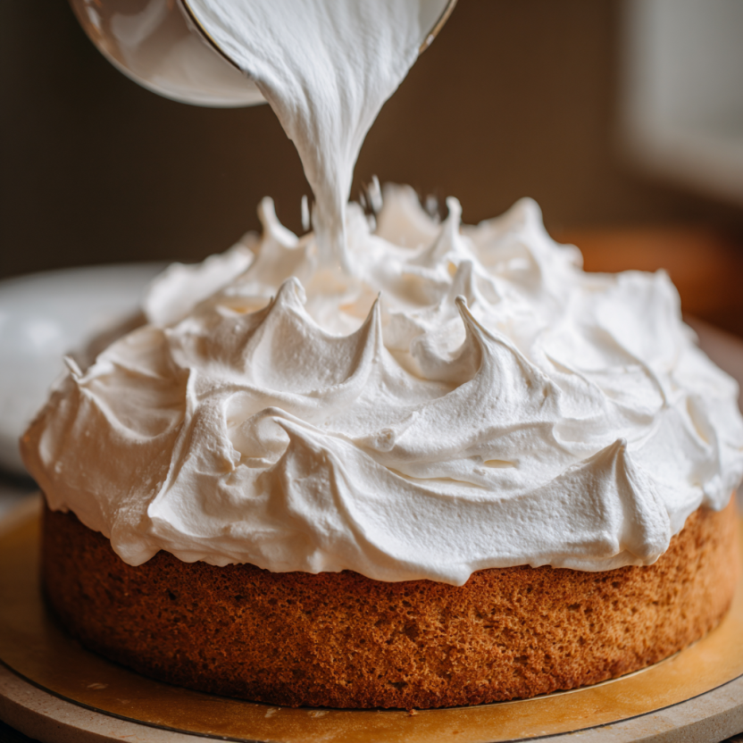 For the snowy meringue, whip egg whites until soft peaks form. Slowly add sugar and vanilla, whipping until thick and glossy. Spread the meringue generously over the cooled cake, creating soft peaks that look like fresh snow.