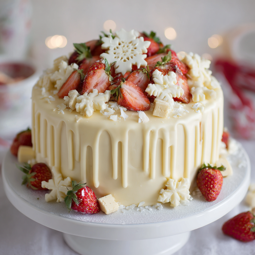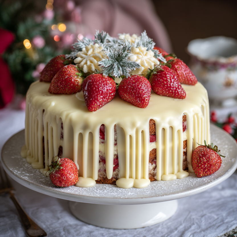 This Strawberry White Chocolate Christmas Cake is a moist, tender holiday dessert infused with rich white chocolate and topped with a bright strawberry glaze. It combines simple ingredients like butter, sugar, eggs, milk, and melted white chocolate for a soft crumb that stays moist for days. The strawberry topping adds freshness and festive color. Perfect for Christmas gatherings, family dinners, or gifting, this easy yet elegant cake is guaranteed to impress. Serve it with whipped cream or warm drinks for a cozy holiday treat everyone will love.