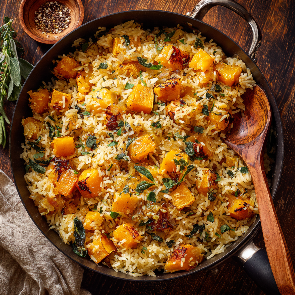 While the squash roasts, heat olive oil in a medium pan over medium heat. Sauté the onion until translucent, about 3–4 minutes. Add minced garlic and cook for another 30 seconds. Stir in the rice and toast it lightly for 1 minute to bring out its nutty flavor.