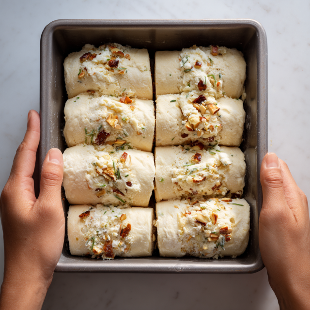 Gently roll the dough into a log and slice it into 8–10 even pieces. Place them in a greased baking dish, leaving a little space between each roll.