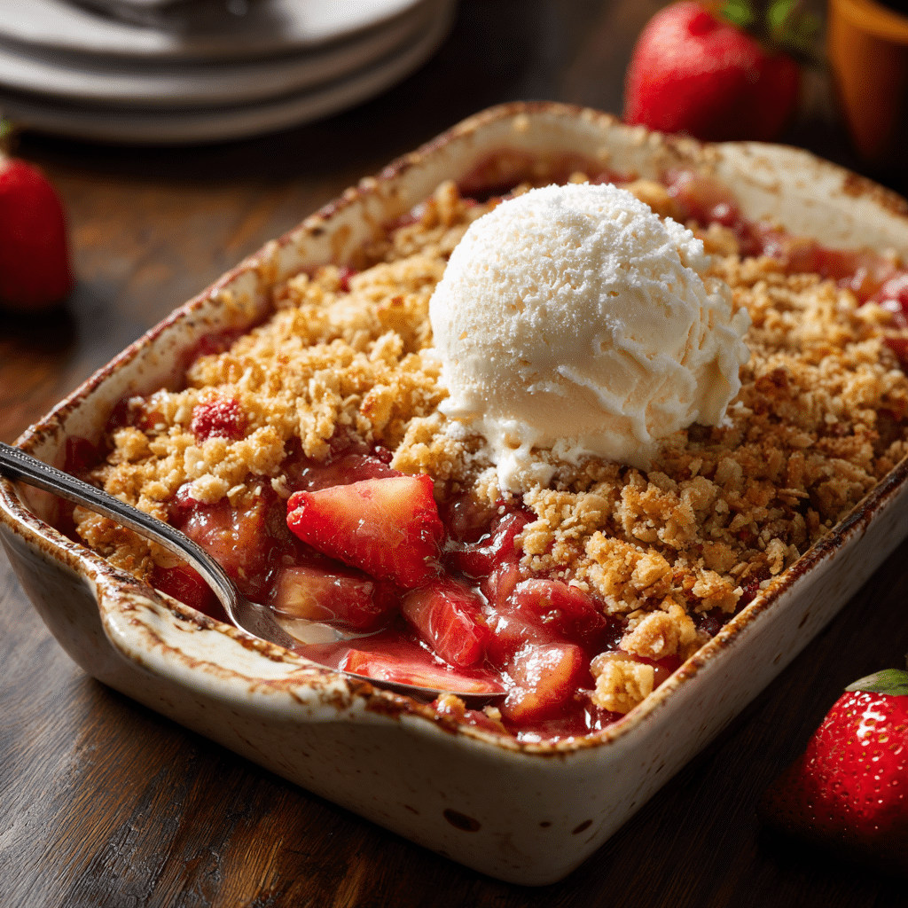 This warm strawberry rhubarb crisp combines sweet strawberries and tangy rhubarb baked beneath a golden oat crumble topping. It’s a cozy, comforting dessert perfect served fresh from the oven with ice cream or cream.