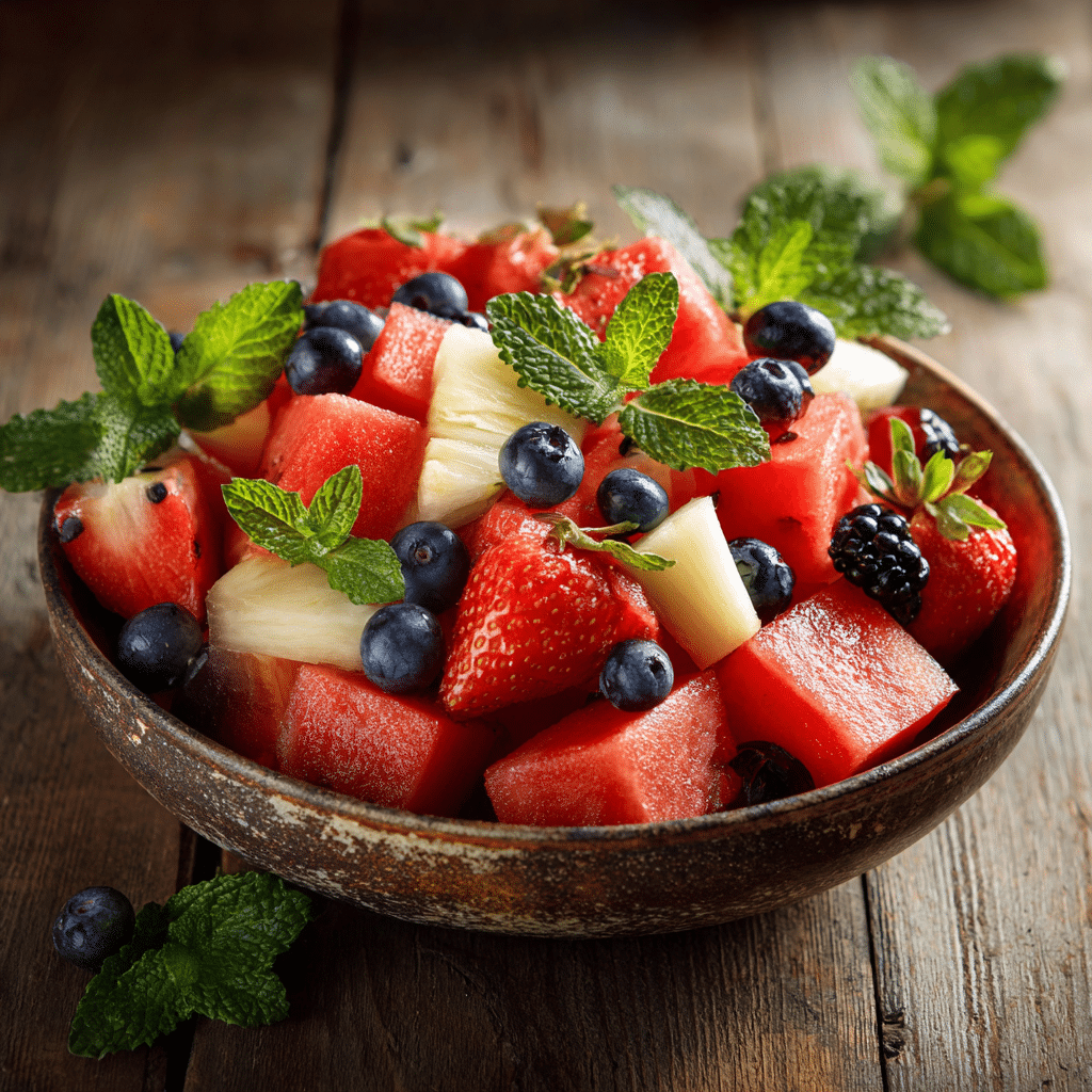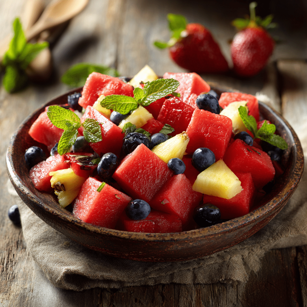 This Watermelon Fruit Salad is a refreshing, colorful mix of juicy watermelon, berries, pineapple, and grapes, tossed with lime juice and fresh mint. It’s quick to prepare, naturally sweet, and perfect for warm days. I love how simple yet vibrant it is a true crowd-pleaser that brings freshness to any table. With just a few ingredients and minimal effort, you can create a light, healthy dish that feels like summer in every bite. Serve it chilled for the best experience, and enjoy a bowl full of natural sweetness and joy.