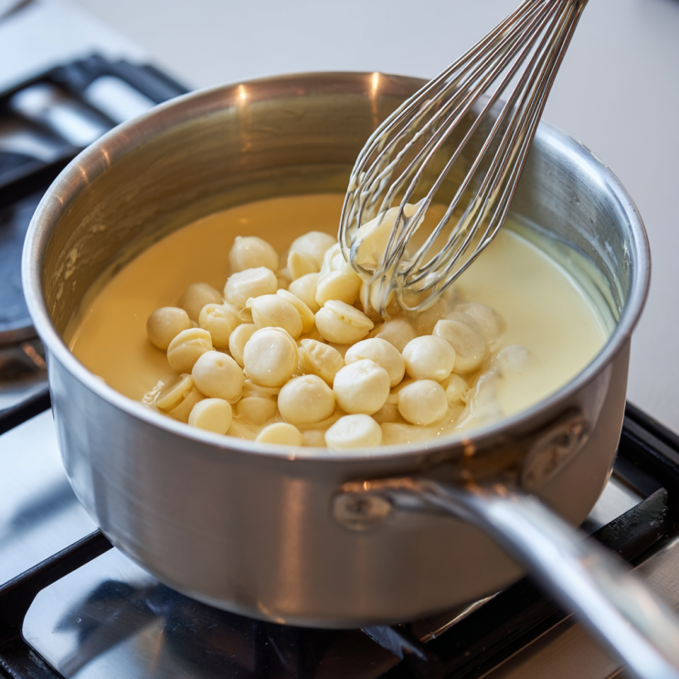 1. Melt white chocolate chips with sweetened condensed milk over low heat.
