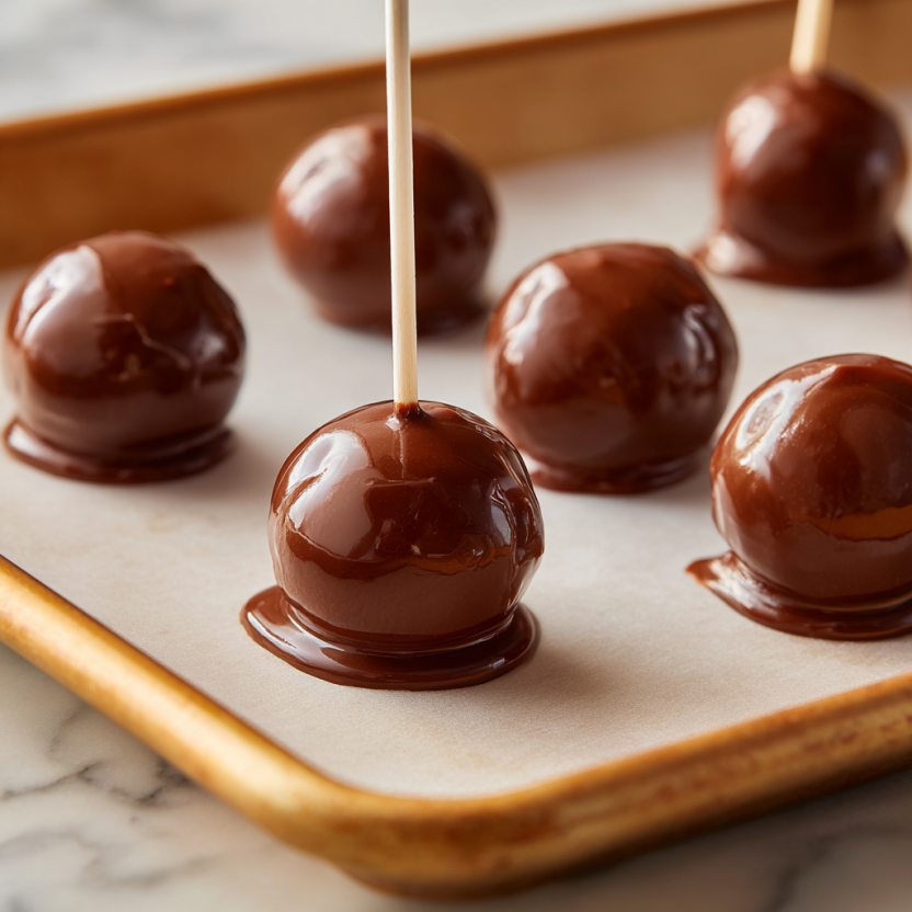Dip each chilled pop into the melted dark chocolate, tapping gently to remove excess. Place them upright in a foam block or back on parchment.