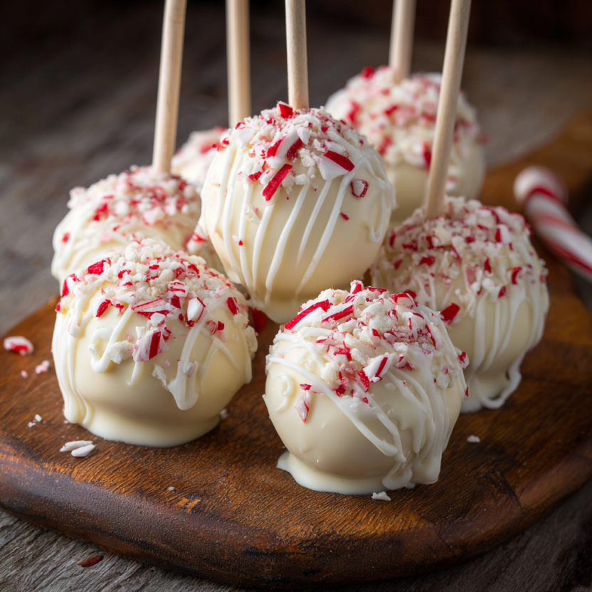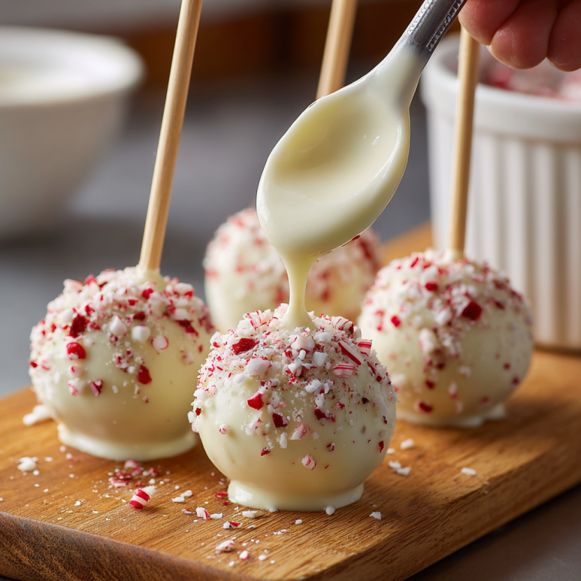 Dip each cake pop into the white chocolate, gently tapping off excess coating. While still wet, sprinkle crushed peppermint pieces over the top.