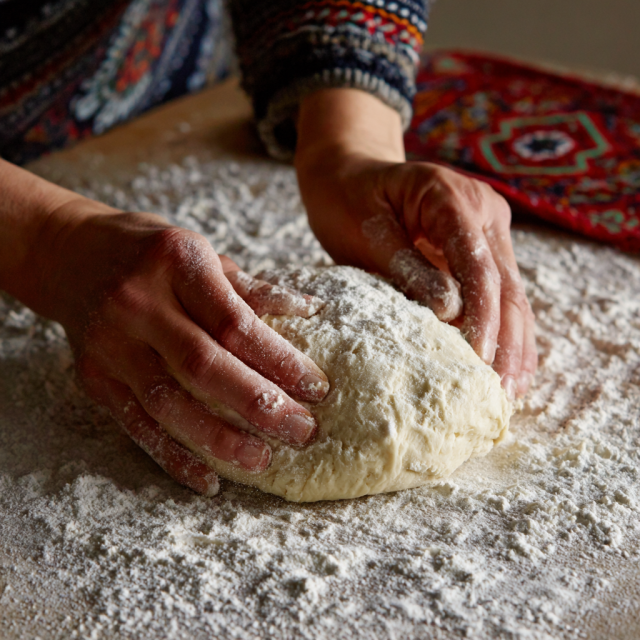 Transfer the dough to a floured surface and knead for about 7–8 minutes, adding small amounts of flour if needed. The dough should be soft and slightly tacky but not sticky.