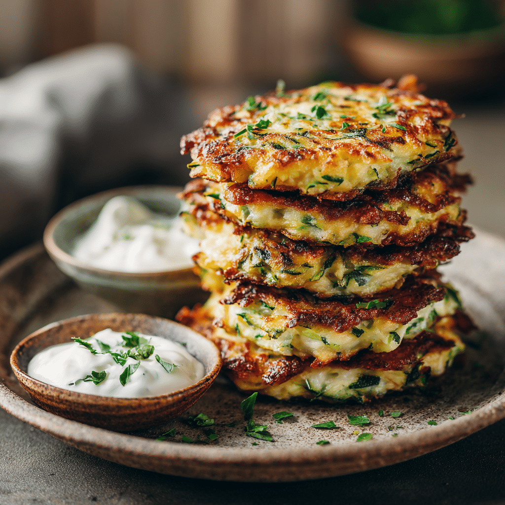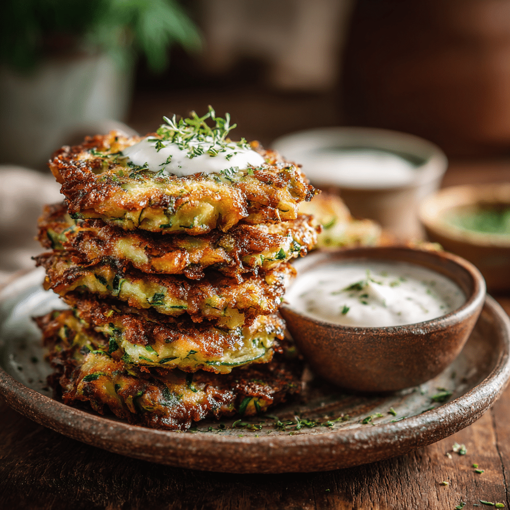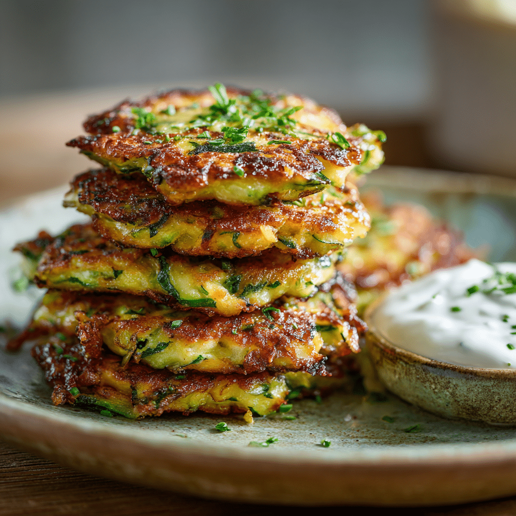 I make zucchini fritters by grating fresh zucchini, salting it, and squeezing out all moisture. I mix it with eggs, flour, parmesan, garlic, and herbs. Then I fry small portions in olive oil until golden and crispy. These fritters turn out soft inside and crunchy outside every time. I serve them warm with yogurt or lemon. They store well in the fridge and reheat beautifully in a pan. This recipe feels simple, comforting, and perfect for any time of day. Zucchini fritters always bring warmth and joy to my kitchen.